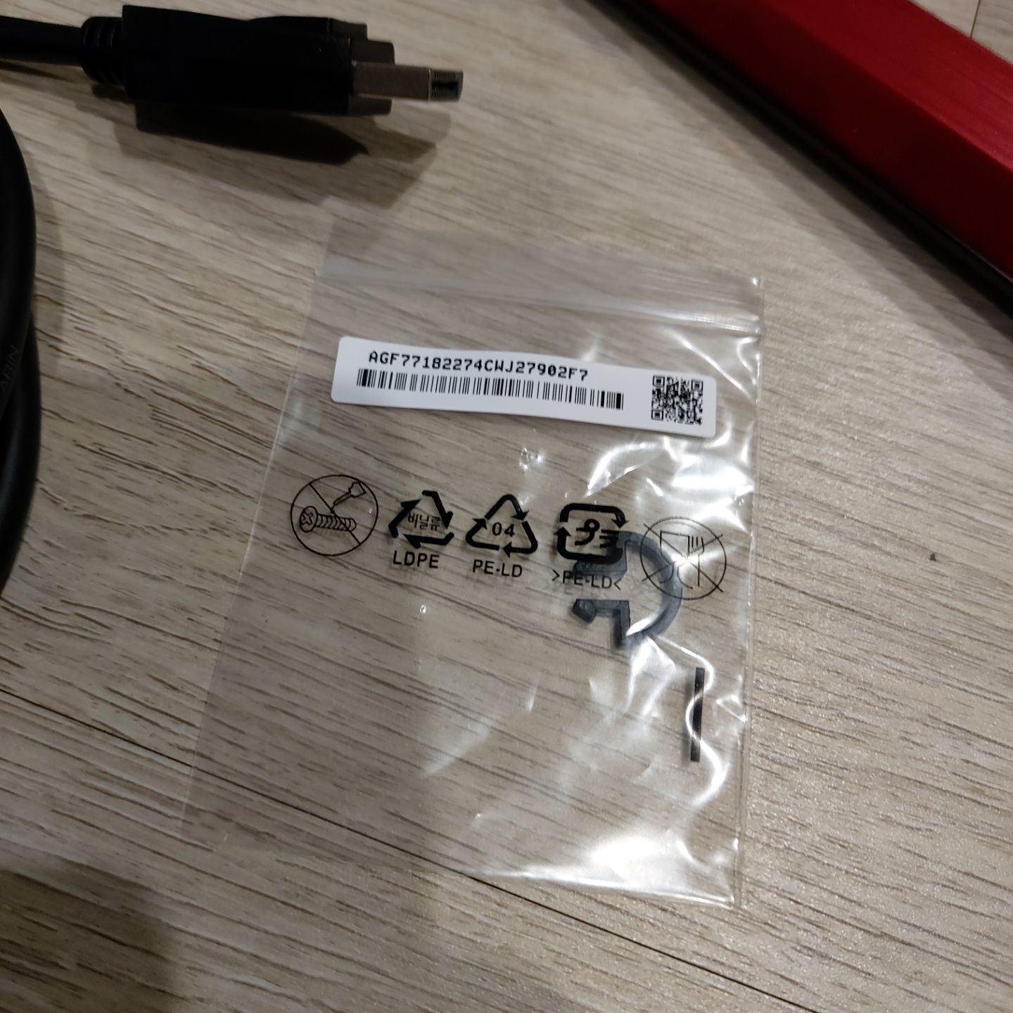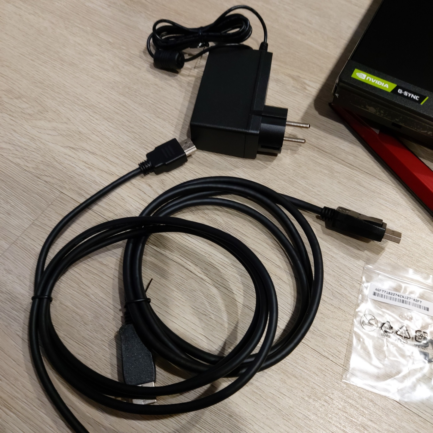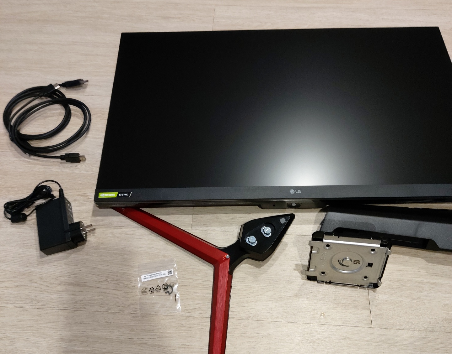제품이 왔기에 조립하기 위해 구성품을 꺼내보았습니다. 패널 본체, 받침대, 기둥, DP 케이블, HDMI 케이블, 전원 어댑터, 정체 불명의 플라스틱 꼬다리 1개 이렇게 구성되어 있습니다.