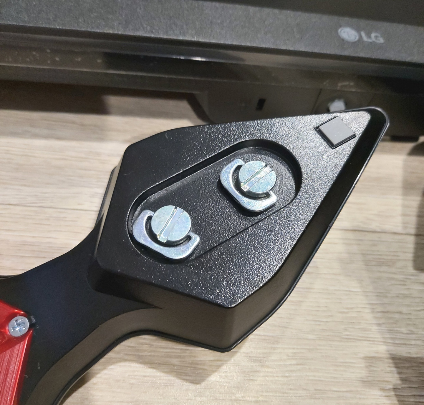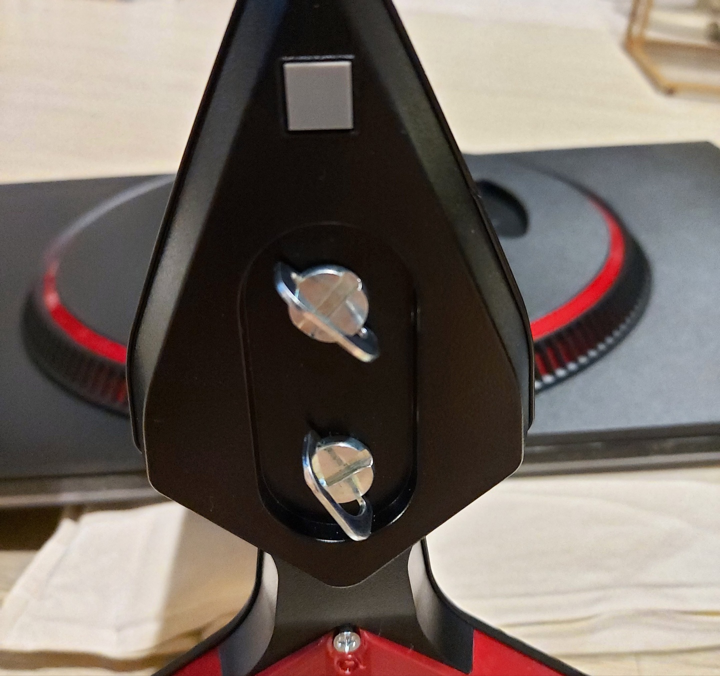 이제 모니터를 세울 받침대를 연결합니다. 모양을 맞춰 그대로 연결하고 아래 보이는 나사 두개를 시계방향으로 돌려서 잠그면 됩니다.