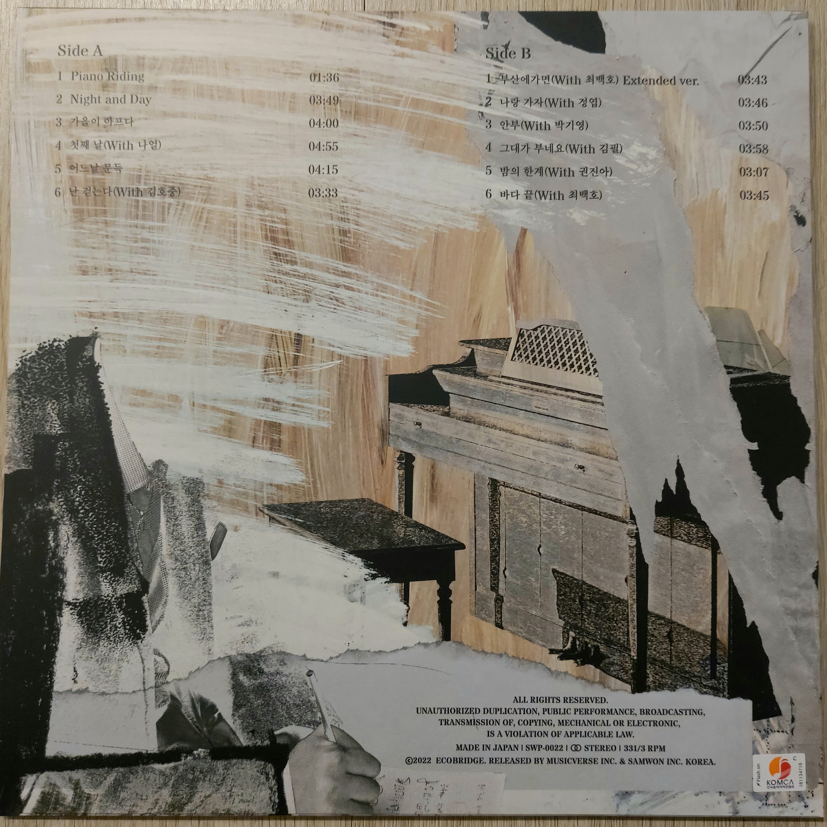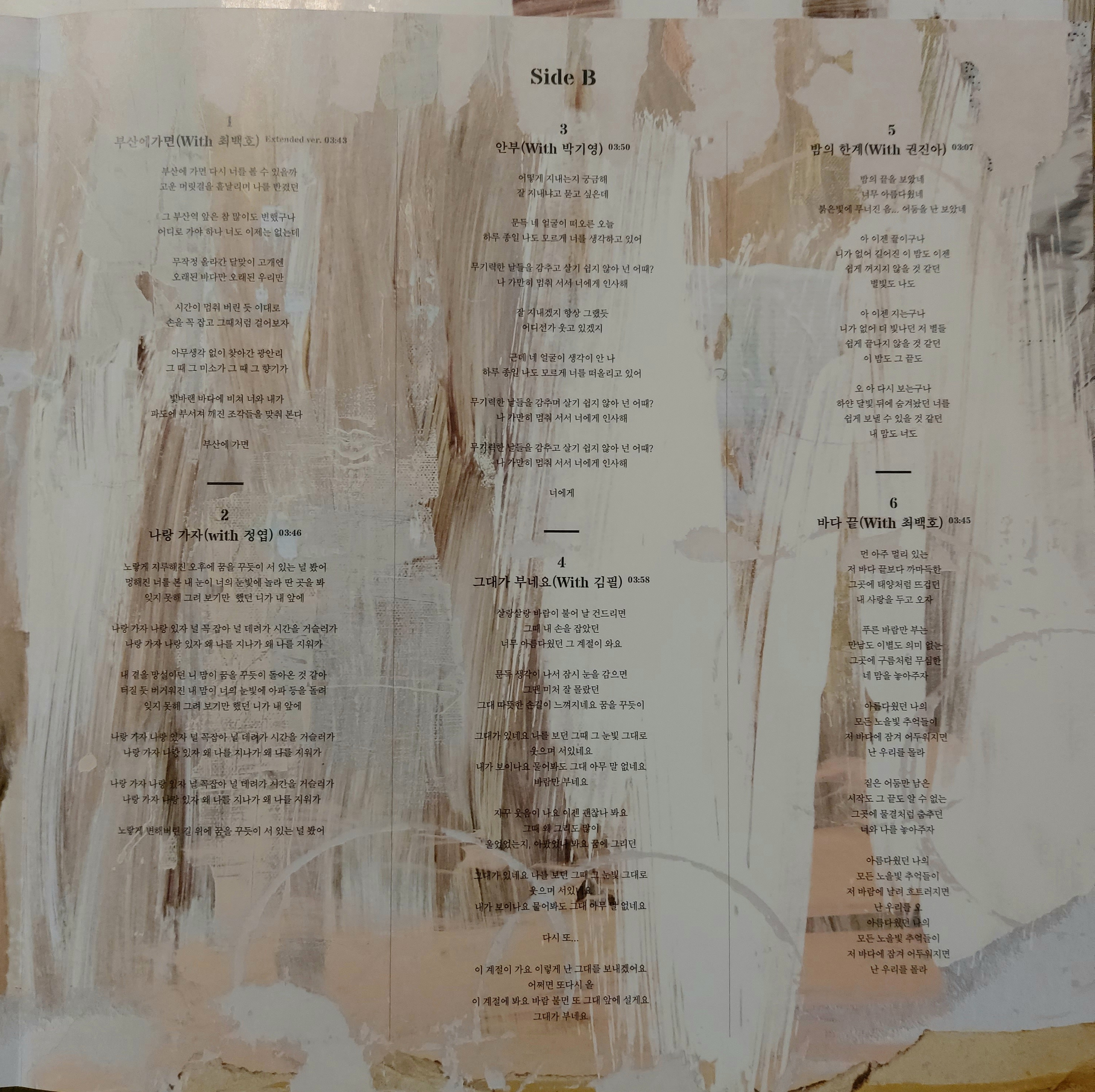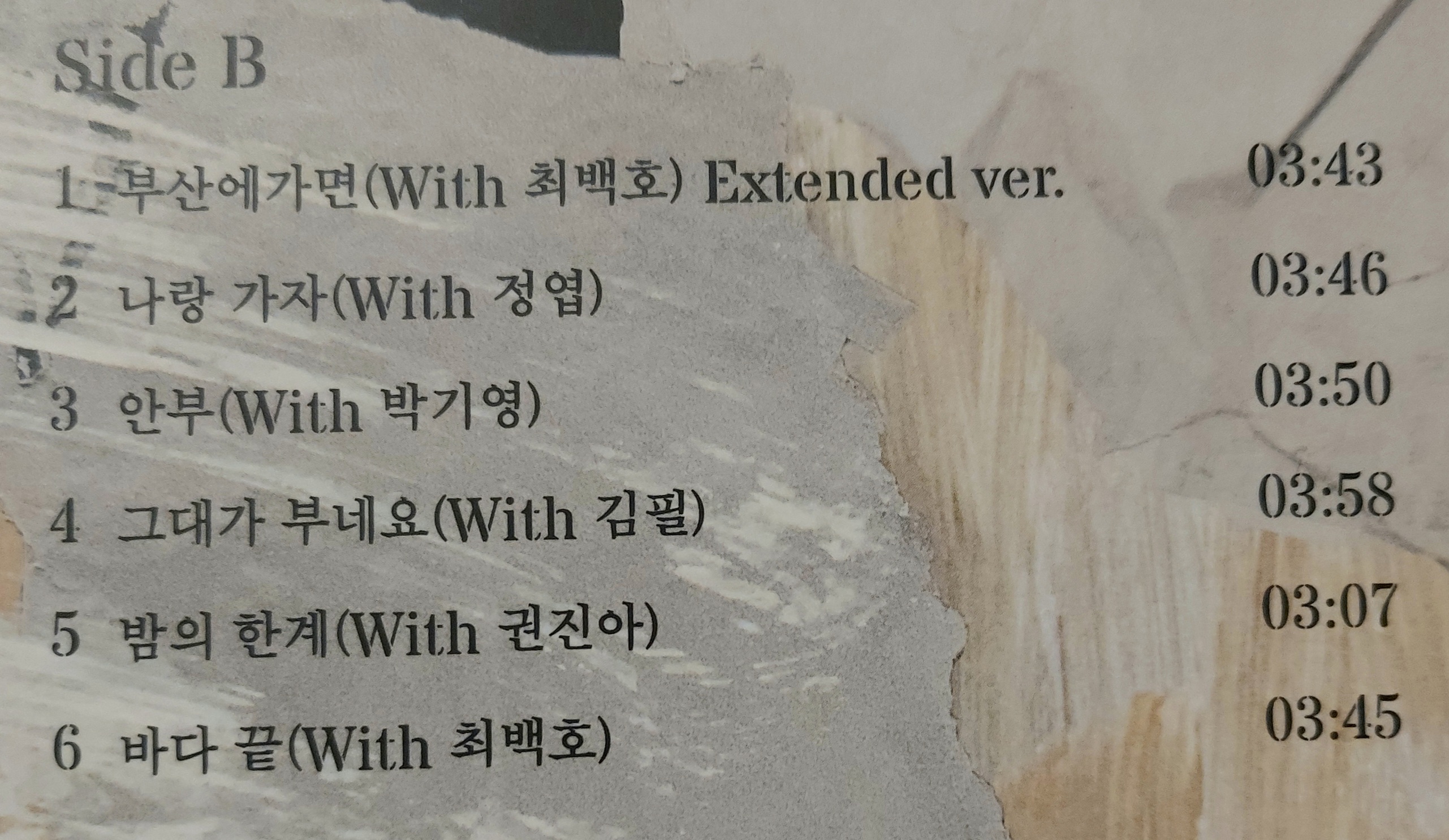 B면에는 최백호님이 부른 '부산에 가면'의 Extented version, 정엽의 '나랑 가자', 박기영의 '안부', 김필의 '그대가 부네요', 권진아의 '밤의 한계', 최백호님의 40주년 기념 앨범 "불혹"에 수록되었던 '바다 끝' 도 들어있습니다.