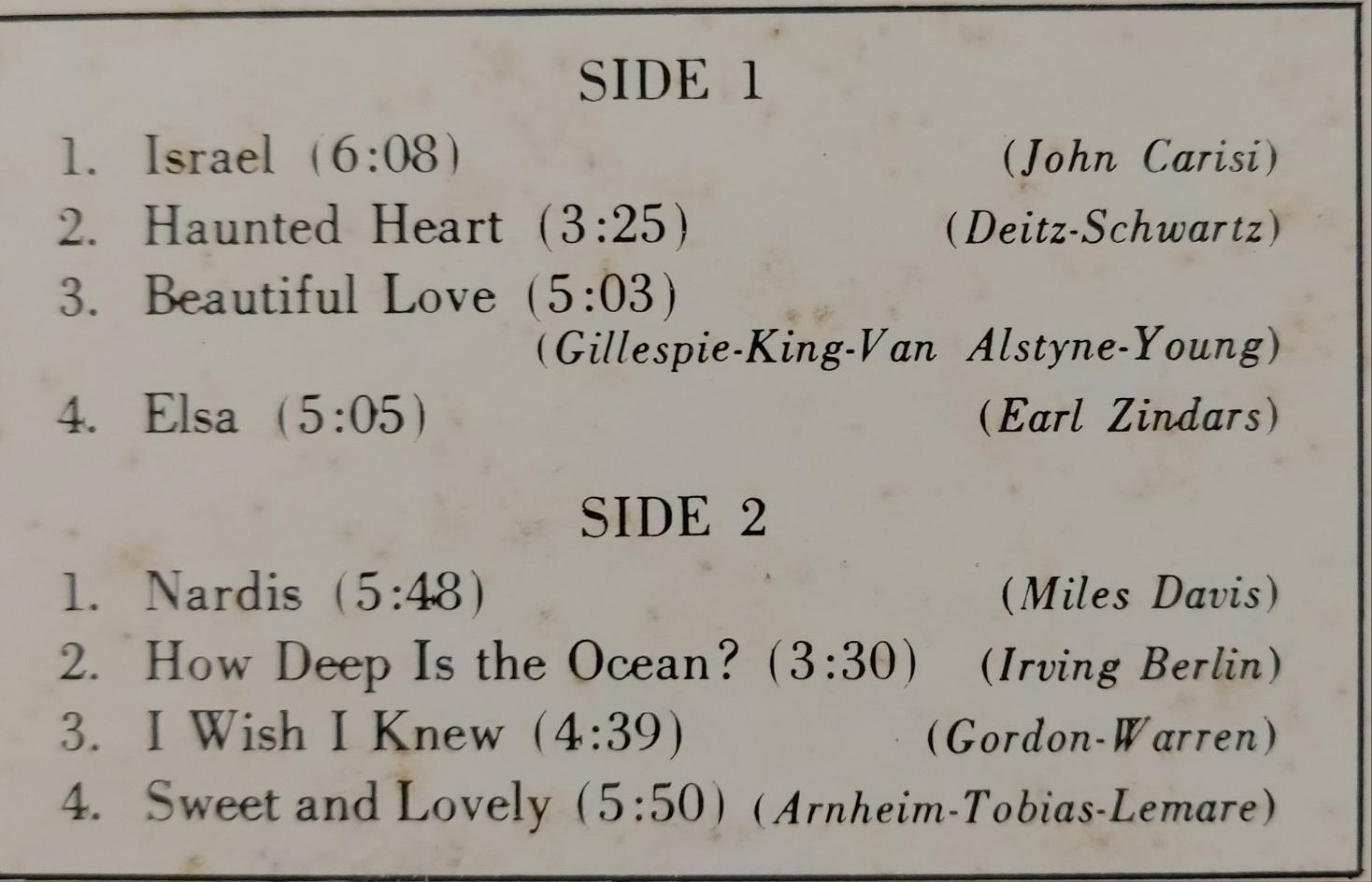 A면 첫번째 곡인 Israel은 트럼펫 연주자이자 작곡가인 John Carisi가 만든 곡으로 재즈 스탠다드가 되었습니다. 당초 1949년에 마일즈 데이비스의 앨범 "Birth of the Cool" 세션으로 녹음되었습니다. 이후 빌 에반스가 이 곡을 자주 녹음하였고, Gerry Mulligan도 녹음하기도 했습니다. John Carisi는 Gerry Mulligan을 위해 편곡도 하였다고 합니다.