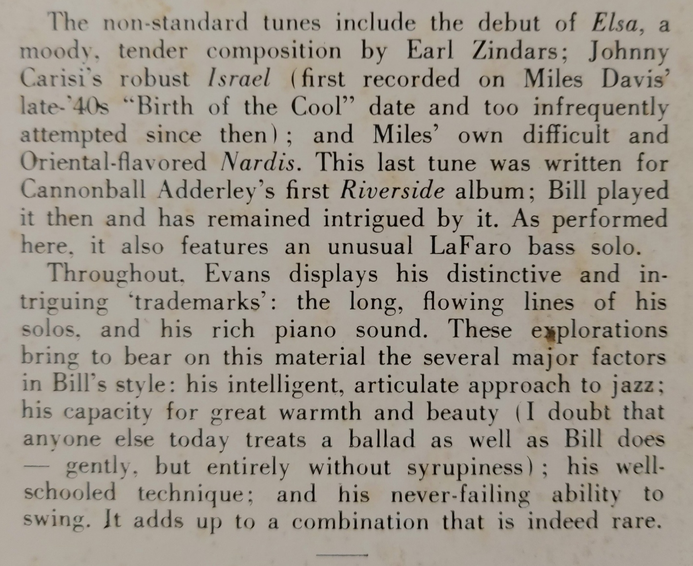 B면 첫번째 곡 Nardis는 마일즈 데이비스(Miles Davis)가 1958년에 만든 곡으로 Cannonball Adderley의 앨범 "Portrait of Cannonball"에서 처음 녹음되었습니다. 이 앨범에는 마일즈 데이비스도 있었고, 빌 에반스도 참여하고 있었습니다. 이후 빌 에반스는 이곡을 여러번 녹음하고 연주하였습니다.