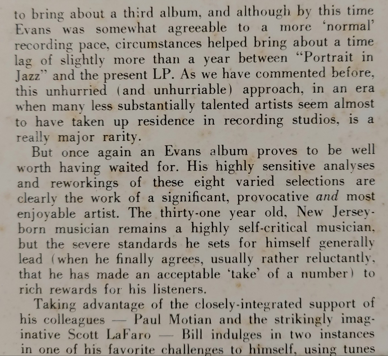 재즈계의 쇼팽이라는 빌 에반스의 가장 최고로 평가받았던 트리오인 Scott LaFaro (베이스), Paul Motian (드럼)과 함께 한 앨범입니다. 빌 에반스는 이 멤버와 총 3번의 연주를 하였고, 앨범은 4장 발매되었습니다.