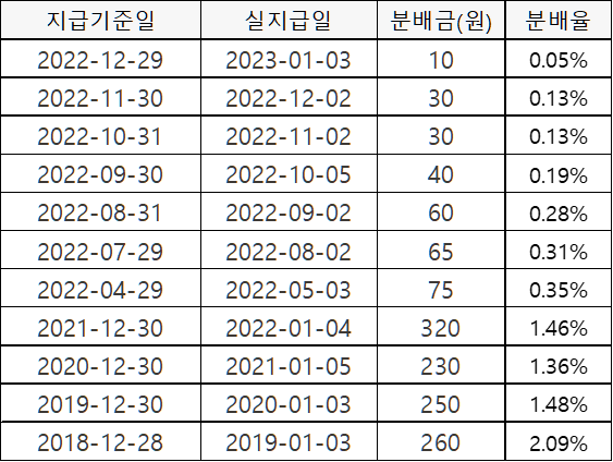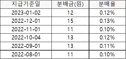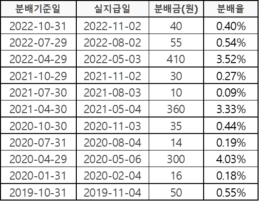 매년 4%대의 분배율을 보이고 있습니다. 22년 10월부터 연 1회에서 분기 배당으로 변경되었습니다. 첫 분기배당이라 분배율이 적지만, 3분기 차수, 4분기 차수로 갈수록 회복되어 연 기준으로는 비슷한 분배율이 될 것으로 예상됩니다.
