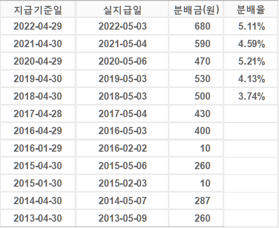 최근 5년간 분배금 및 분배율은 아래와 같습니다.