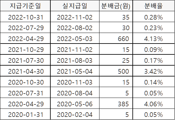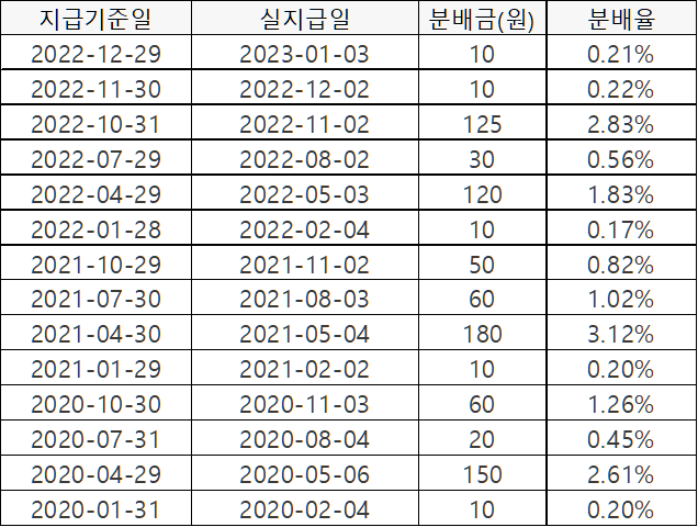 1월, 4월, 7월, 10월 분기별 배당이지만, 21년부터는 4월, 7월 10월 배당합니다. 연 기준으로 보면, '20년 4.31%, '21년 3.69%, '22년 4.64%의 분배율을 보였습니다.