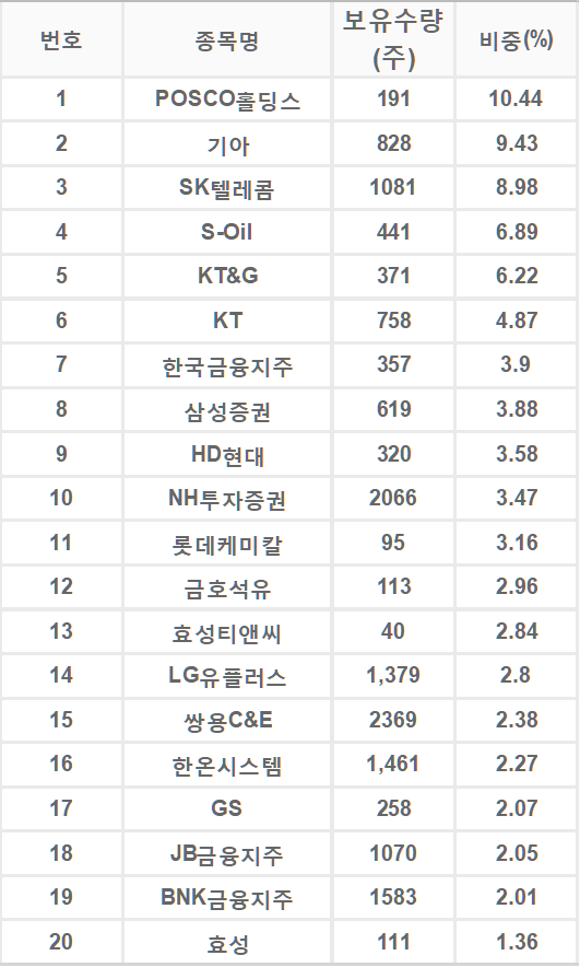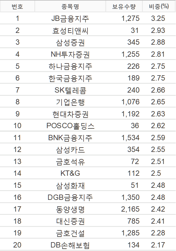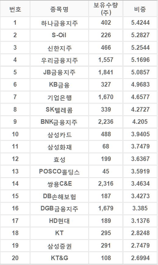 - 보유종목 : 10위안에 금융 회사가 8곳이나 포함되어 있어 금융업 비중이 상당합니다.