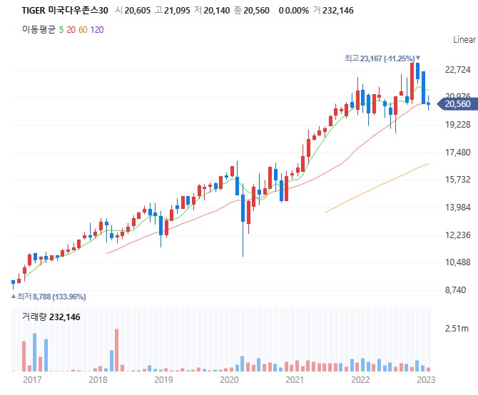 다우존스30의 명성답게 미국 주식 시장의 성장세에 맞춰 월간 차트 우상향입니다.