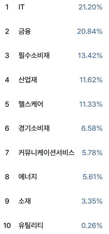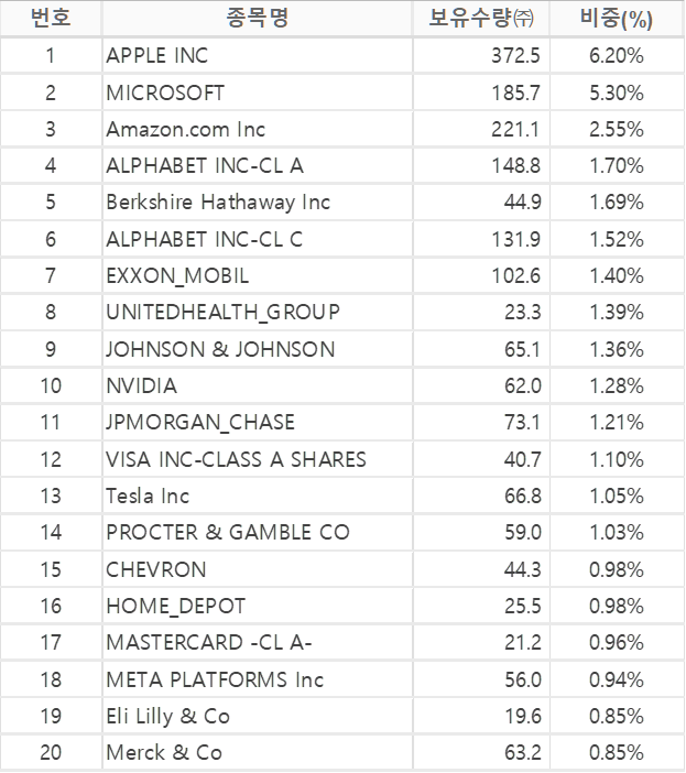 - 보유종목 : S&P 500이라는 타이틀에 맞게 500 종목을 보유중입니다.