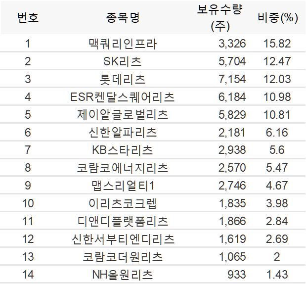 - 보유종목 : 고배당의 정석인 맥쿼리인프라를 가장 많이 담고 있으며, SK리츠/롯데리츠 등 다양한 리츠