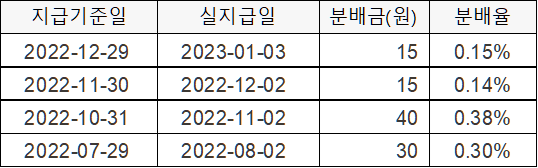 '22년 10월부터 월 분배로 변경되었습니다. 최초 상장일이 '22년 5월로 아직 1년이 채 되지 않았습니다.