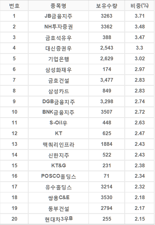 - KOSPI 지수 구성 종목 중 배당수익률이 높고, 변동성은 낮은 종목에 투자합니다.
