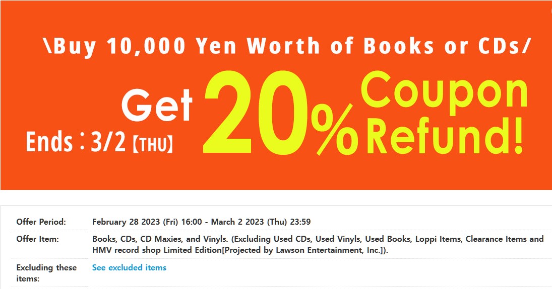 Offer Item : Books, CDs, CD Maxies, and Vinyls. (Excluding Used CDs, Used Vinyls, Used Books, Loppi Items, Clearance Items and HMV record shop Limited Edition[Projected by Lawson Entertainment, Inc.]).