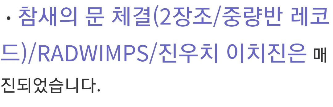 radwimps를 검색하면 "스즈메의 문단속" OST도 재고가 있다고 나오지만, 막상 구매 버튼을 누르면 매진되었다는 문구가 나옵니다.