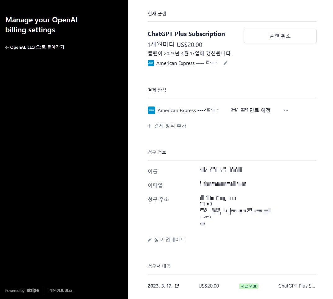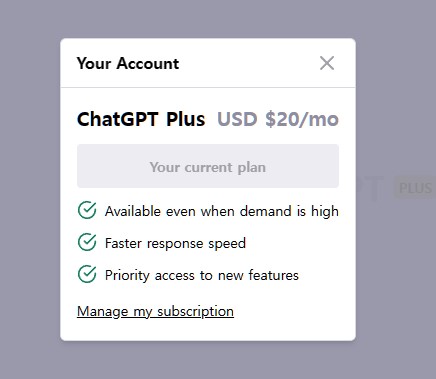 이제 좀 더 똑똑해졌다고 하는 GPT-4와 대화가 가능합니다. 본격적으로 스마터 챗봇과 대화하기 전에, 만약 해지를 하고 싶으면 어떡하냐구요? 역시나 왼쪽 아래쪽을 보면 'My account'가 있습니다. 그걸 클릭하시면... 아래와 같이 지금 월 20달러짜리 유료를 사용하고 있다고 보여줍니다. 그리고, 맨 아래쪽에 "Manage my subscription"이라고 줄쳐진 문구가 있습니다. 이걸 클릭하시면 됩니다.
