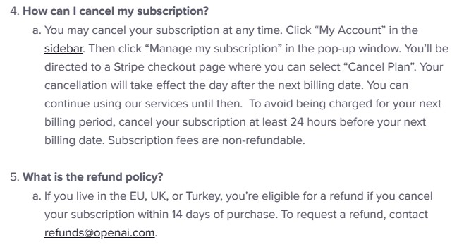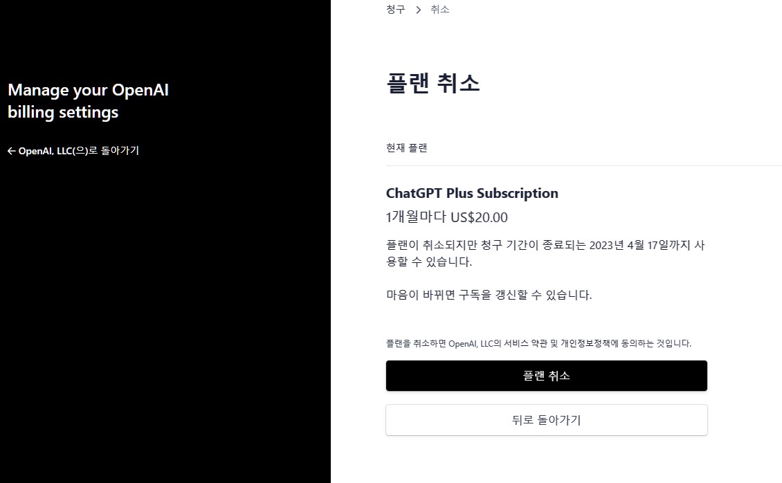 아마도 아래 화면이 취소 직전 마지막 화면일 것입니다. 취소를 하게 되더라도 이미 낸 한달의 유효기간까지는 사용이 가능하다고 알려주고 있습니다. 구독하자마자 취소가 가능하냐구요? 내가 한번도 써보지 않았다는 조건하에서? 이건 별도로 메일을 보내 문의해봐야 알듯 합니다만, EU를 제외하고는 환불 불가인 것으로 보입니다. 취소에 대한 정책은 이 다음 칸에 나옵니다.