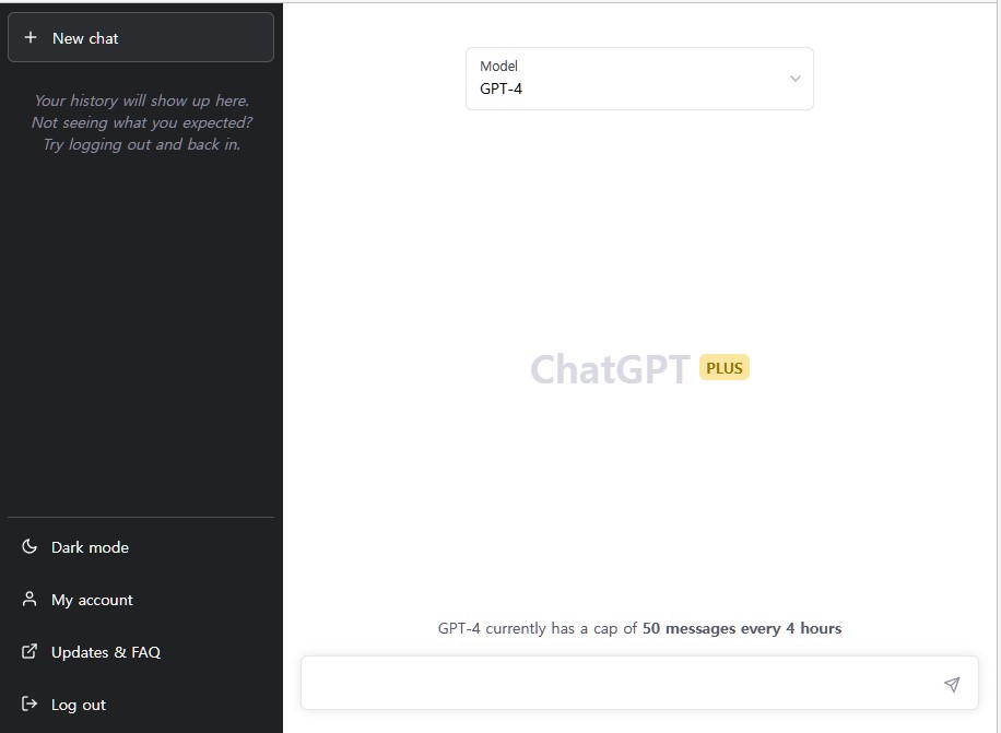 그렇게 되면 기존 챗GPT와 유사한 화면이 나옵니다. 그런데, 한달에 20달러나 지불하는데도, 4시간에 50개의 메시지만 대응을 하는가 봅니다. (GPT-4 currently has a cap of 50 messages every 4 hours)