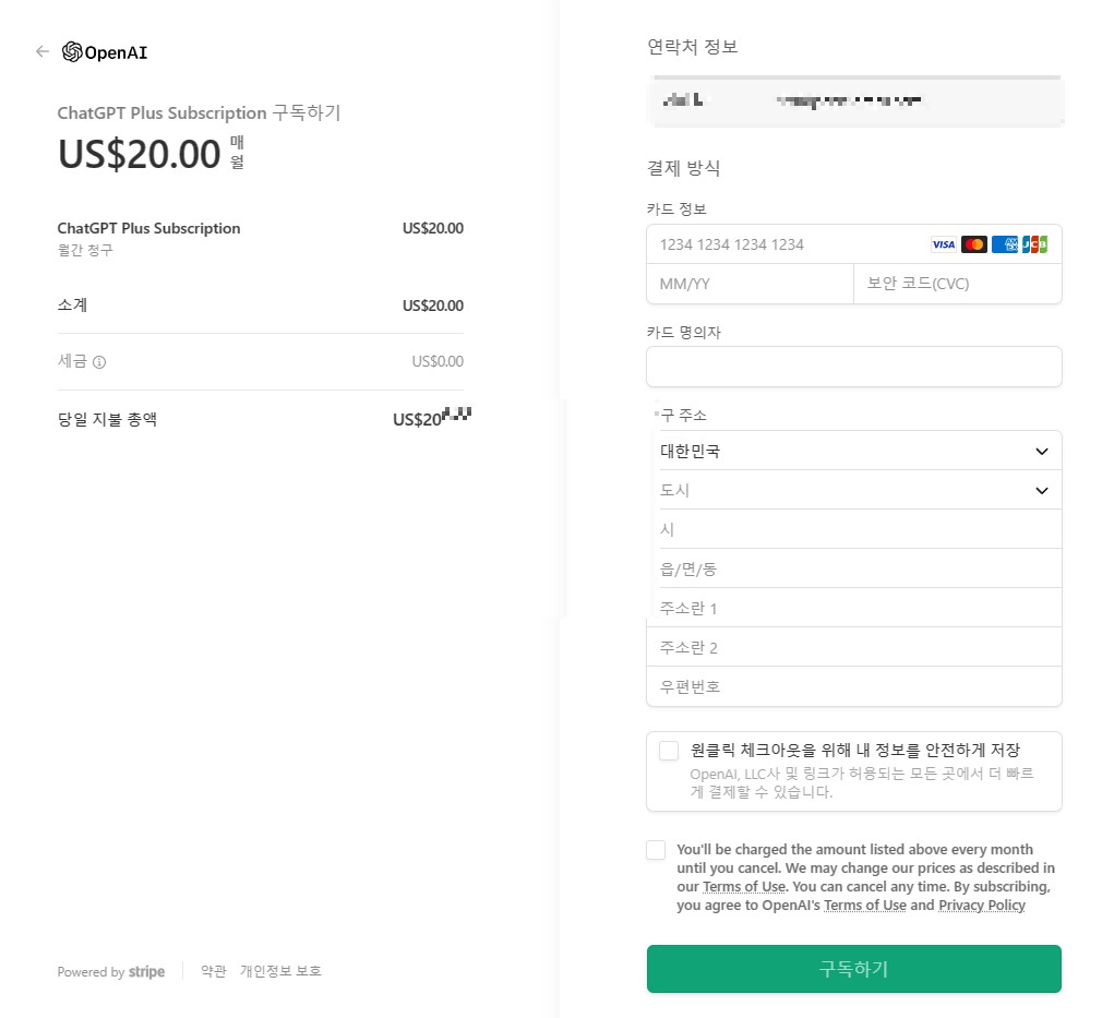 위 화면에서 "Upgrade Plan"을 클릭하면 아래 화면처럼 바로 카드 입력하는 메뉴가 나옵니다. 깔끔하게 바로 카드 정보를 요청합니다. 한달에 20달러이니, 많을수도 적을수도 있지만, 개인적으로는 아직 99%의 정확성에 미치지 못하면서 너무 비싸게 돈을 받는게 아닌가 생각이 듭니다. 어쩃거나 지금도 계속 점검하고 개선중인 과정일테니까요. 많은 사용자들을 통해 사실상 무료 테스트와 유료 테스트를 하는 셈으로 보입니다.