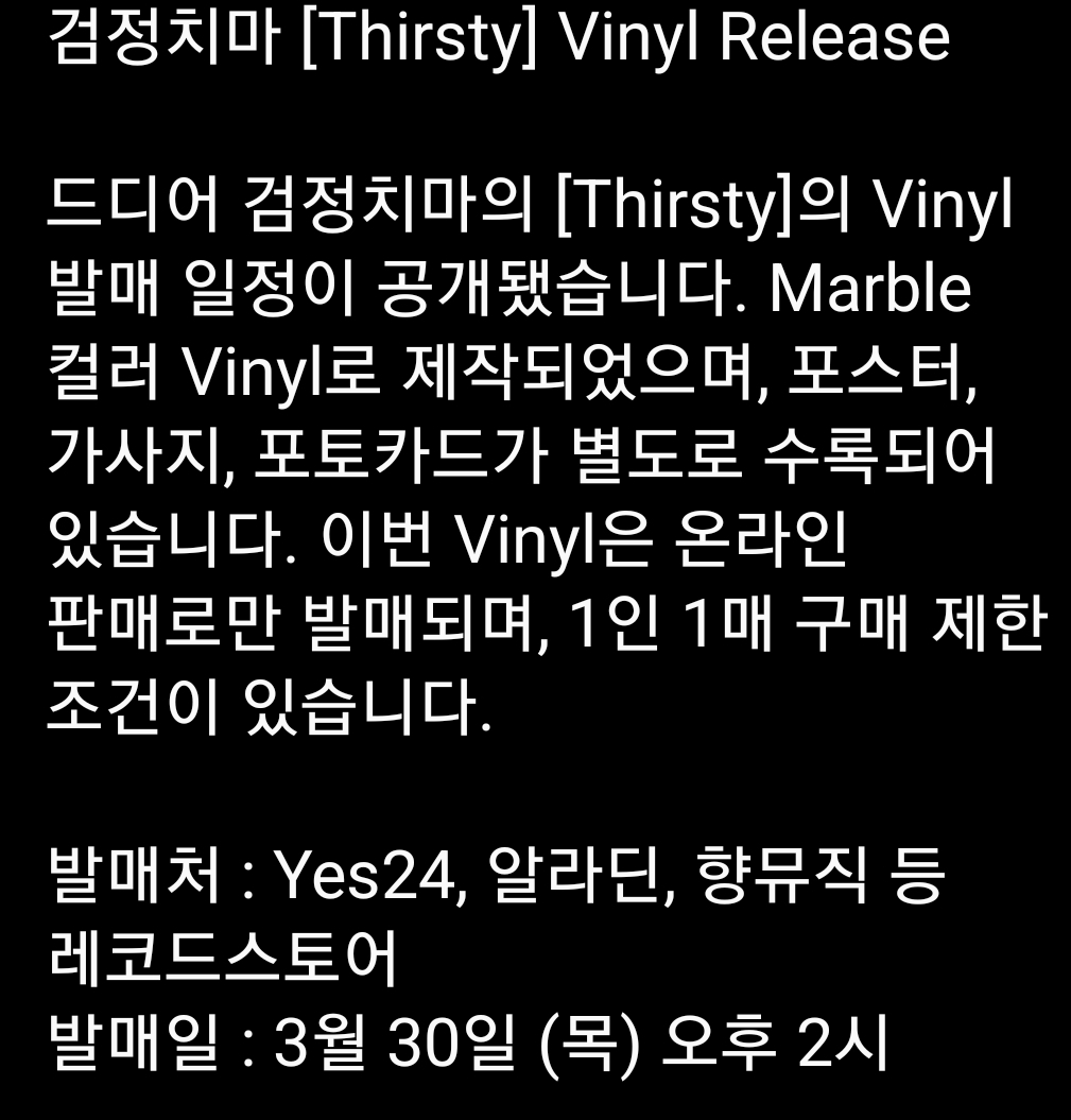 작년 2022년 12월에 발매된 검정치마의 3집 Part.1인 "Team Baby"(팀베이비)에 이어 3집 Part.2인 "Thirsty"가 3월 30일 (목) 오후 2시에 발매됩니다.