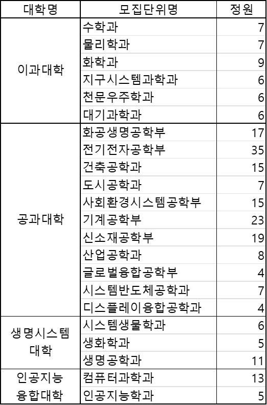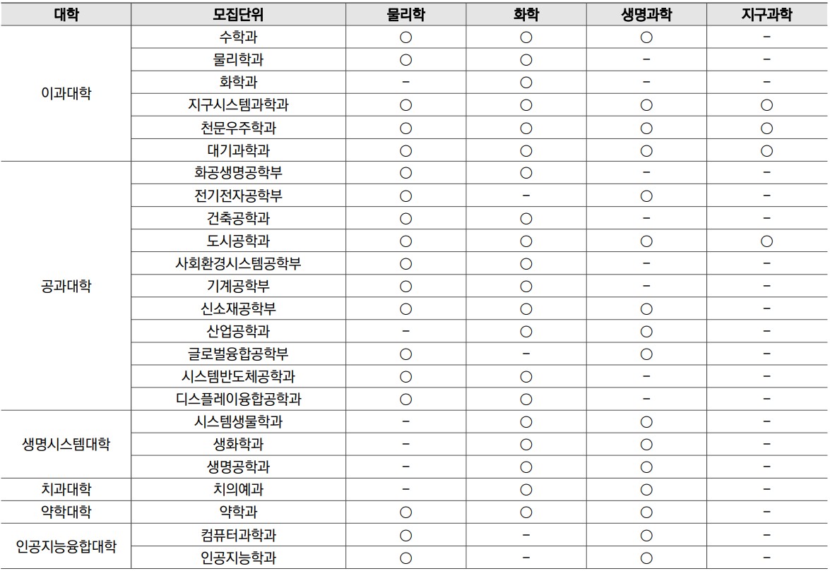 . 과학과목은 물리학, 화학, 생명과학, 지구과학 중 각 모집단위별로 전공 특성을 반영한 지정된 과목
