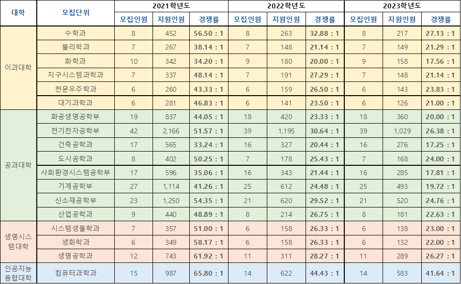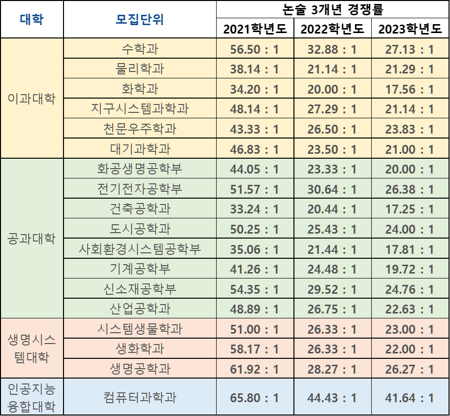최근 3개년 (2021학년도, 2022학년도, 2023학년도) 논술 전형의 자연계열 학과별 경쟁률입니다.
