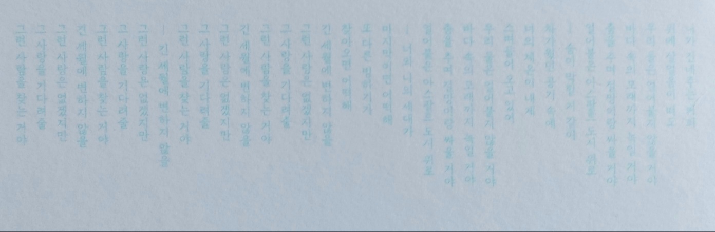 앨범 뒷면에는 가사가 수록되어 있는데, 노래 제목과 가사가 방향이 다르게 되어 있습니다 ^^; 그리고, 그 가사는 옛날 책에서 보던것처럼 세로 쓰기로 오른쪽에서 왼쪽으로 진행됩니다. 아래는 제가 가장 좋아하는 Antifreeze의 가사입니다 ^^