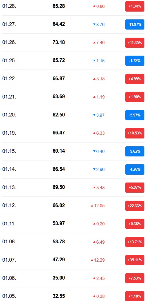 아래는 2021년 1월의 주가 변동입니다. 1월 7일 SK그룹의 지분 인수 기사가 나오고 나서는 폭등을 하였고, 급기야 1월 26일에는 73.18달러까지 찍었습니다. 이때 제법 많은 분들이 SK그룹의 안목을 믿고 투자했던 것으로 기억합니다 ^^; 저도 그렇구요. 사실 수소 관련 기업이나 기타 친환경 에너지 기업들이 이후 다들 폭락하여 대부분 마이너스 70% 이상 적자를 본 상태일 것으로 생각됩니다.