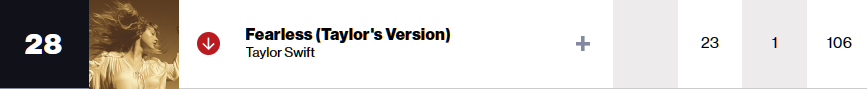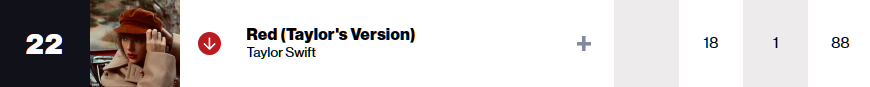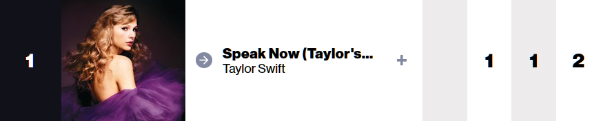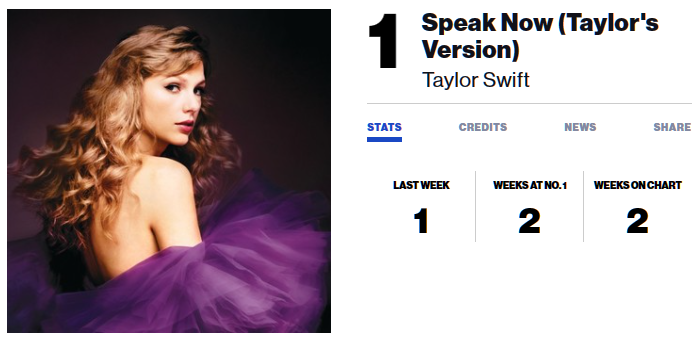 Taylor Swift의 재녹음 앨범 "Speak Now (Taylor's Version)"이 지난주 1위 데뷔한데 이어 이번주에도 1위를 지키고 있습니다. 재녹음 앨범이 지금까지 세장 발매되었는데, 유일하게 데뷔 2주차까지 1위를 지킨 경우라고 합니다.