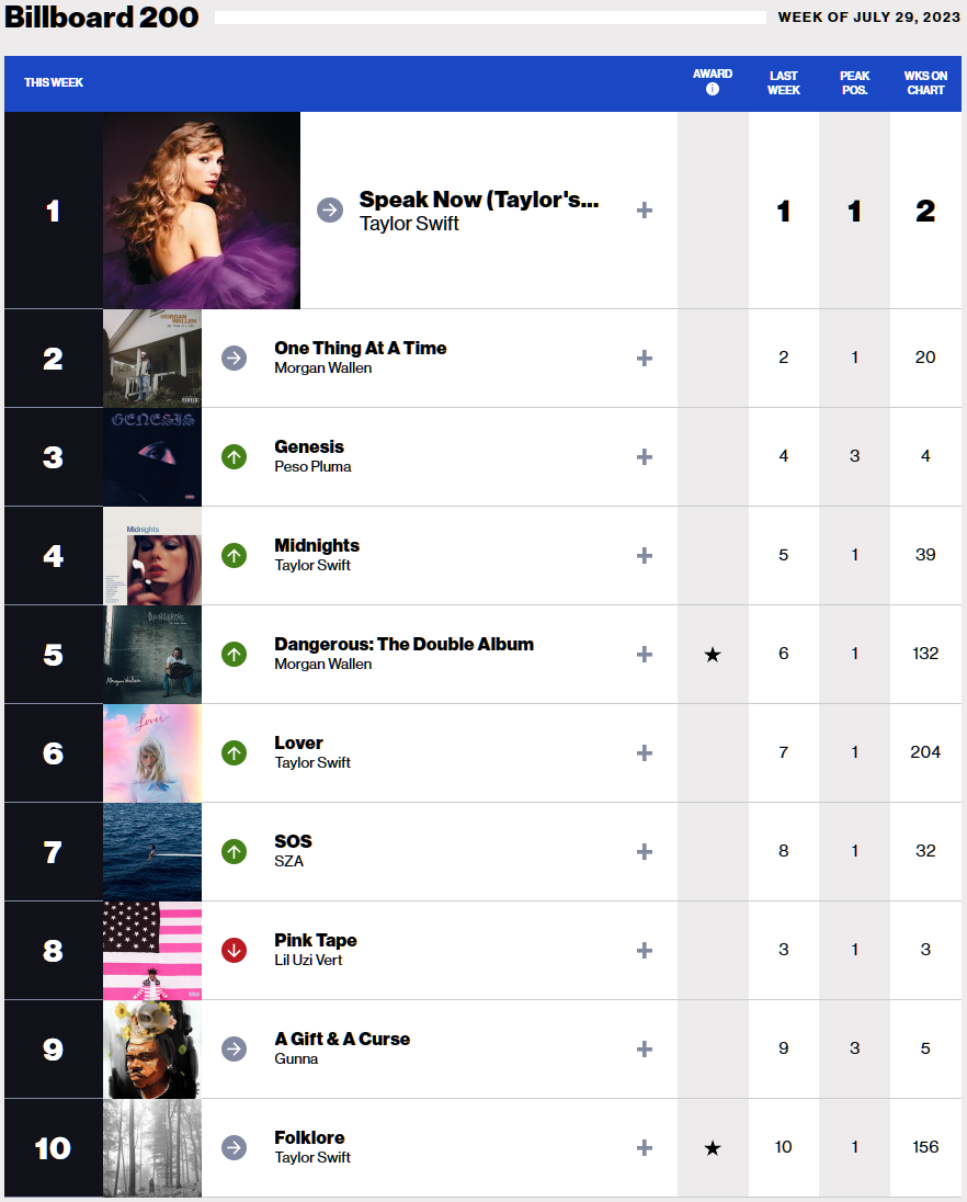 2023년 7월 22일자 빌보드 Hot 100 / 빌보드 200 차트 분석, Morgan Wallen의 Last night 1위 재탈환 (14주), Taylo
