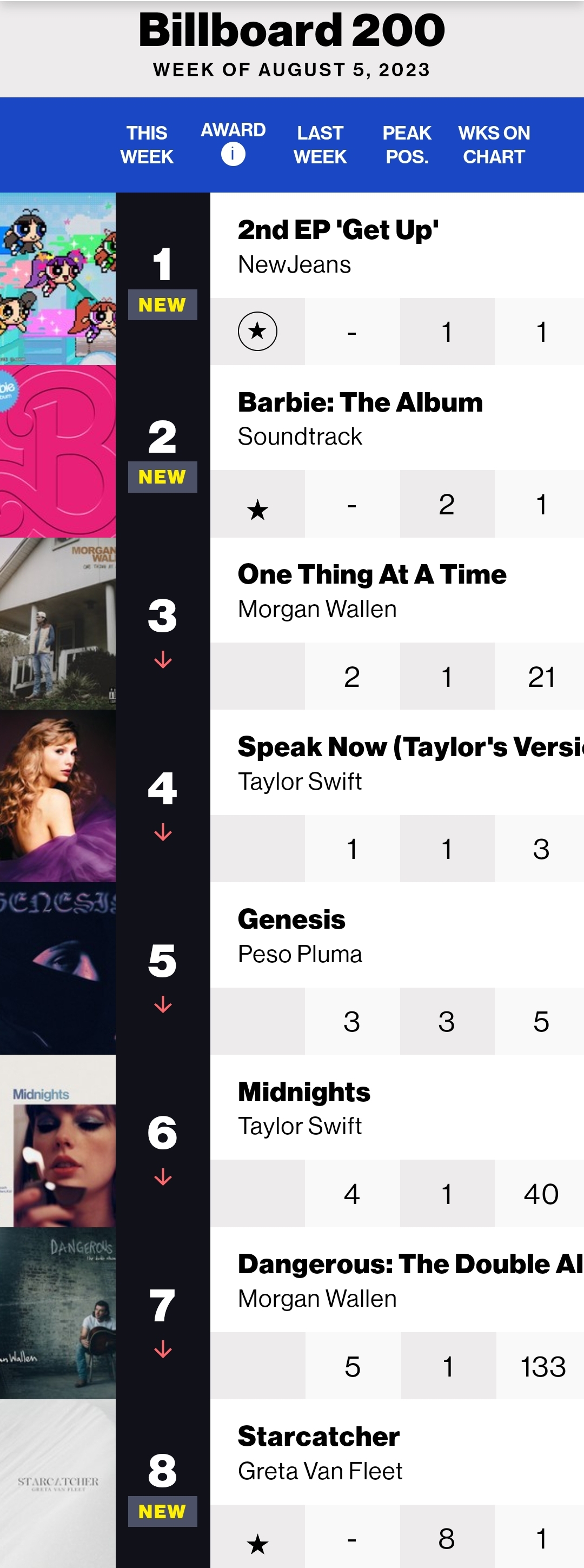 2023년 8월 5일자 빌보드 차트 분석 : 뉴진스 3곡 Super shy/ETA/Cool with you 동시 Hot100 차트인, 미니 2집 "Get Up" 빌보드 200에 1위로 데뷔