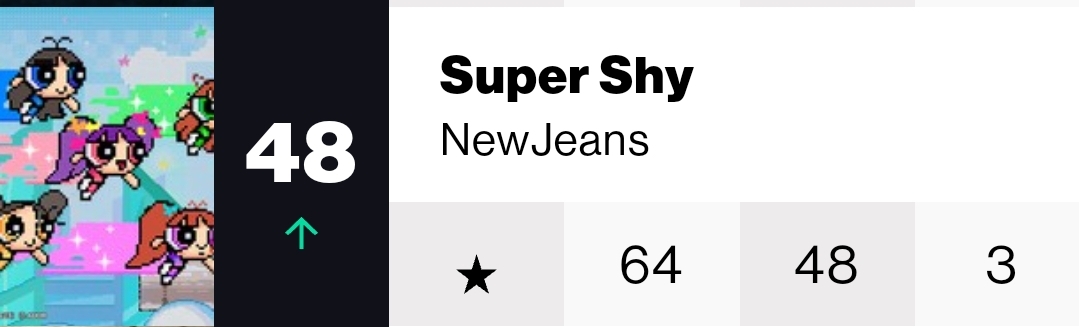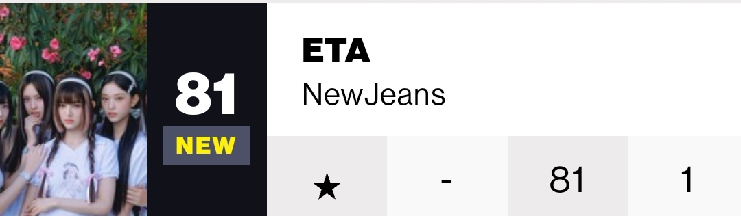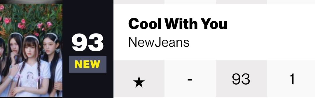 미니 2집 "Get Up"으로 이번주 앨범 차트 빌보드 200에 1위로 데뷔한 뉴진스 (NewJeans)는 트리플 타이틀곡 3곡을 모두 차트에 올려놓고 있습니다. 우리나라 아티스트의 3곡이 한꺼번에 빌보드 Hot 100 차트에 진입한 것은 BTS 이후 처음이라고 합니다. 이제 3주차에 접어든 Super shy는 48위로 전주에 비해 16계단 상승했고, 애플 아이폰 광고에 열심히 나오고 있는 ETA는 이번주 81위로 차트 데뷔하였습니다. 그리고 Cool with you도 93위로 차트 데뷔하였네요.