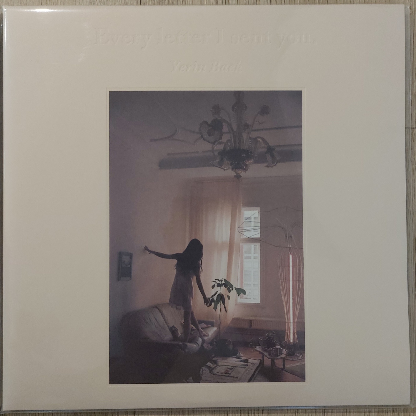 백예린 1집 "Every Letter I sent you"의 재발매반 LP 전면 자켓입니다. 앨범 제목과 가수 이름이 음각으로 새겨져 있습니다.
