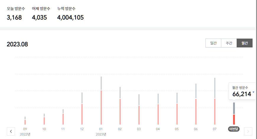 별 의미는 없지만, 어제 2023년 8월 17일에 2008년 9월 블로그 개설 이후 거의 15년만에 누적 방문자수 4백만을 넘었습니다 ^^; 개설 이후 몇달간 반짝 열혈 포스팅을 하다가 거의 10년 이상 방치해두다가 작년 2022년부터 다시 활동을 재개한 것입니다. 그런데, 이 복귀 포스팅이 얼마나 갈지는 저도 잘 모르겠습니다 ^^;