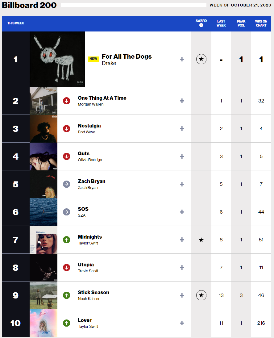 앨범 차트인 빌보드 200 차트에서도 Drake는 8집 앨범 "For All The Dogs"로 1위 데뷔하였습니다. 이는 빌보드 200 차트에서의 13번째 1위 앨범으로 Drake는 Taylor Swift와의 동점을 깨고 차트에서 세 번째로 많은 1위를 기록했습니다. 가장 많은 1위 앨범은 19개의 비틀즈 (The Beatles)이며, 2위는 14개의 Jay-Z 입니다. 3위는 13개의 Drake, 4위는 12개의 Taylor Swift 입니다. 참고로 Taylor Swift는 2006년 데뷔 앨범 "Taylor Swift"를 제외하고는 2008년 2집 앨범 "Fearless" 이후 모든 정규 앨범 및 재녹음 앨범이 1위로 데뷔하였다고 합니다.