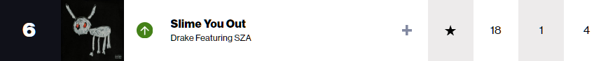 No. 6, Drake feat. SZA, “Slime You Out” (up from No. 18; peaked at No. 1)
