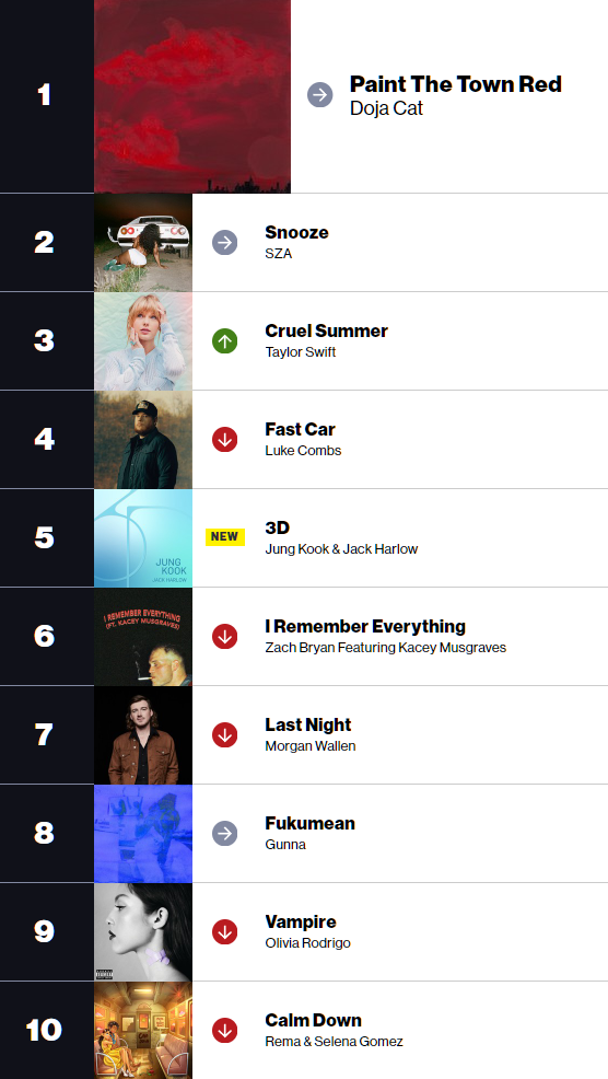 Rema & Selena Gomez의 'Calm down'이 차트 아웃하였기에, 이번주 Hot 100 차트 노래중 가장 오래 머물고 있는 노래는 Taylor Swift의 Anti-hero 51주가 되었습니다.