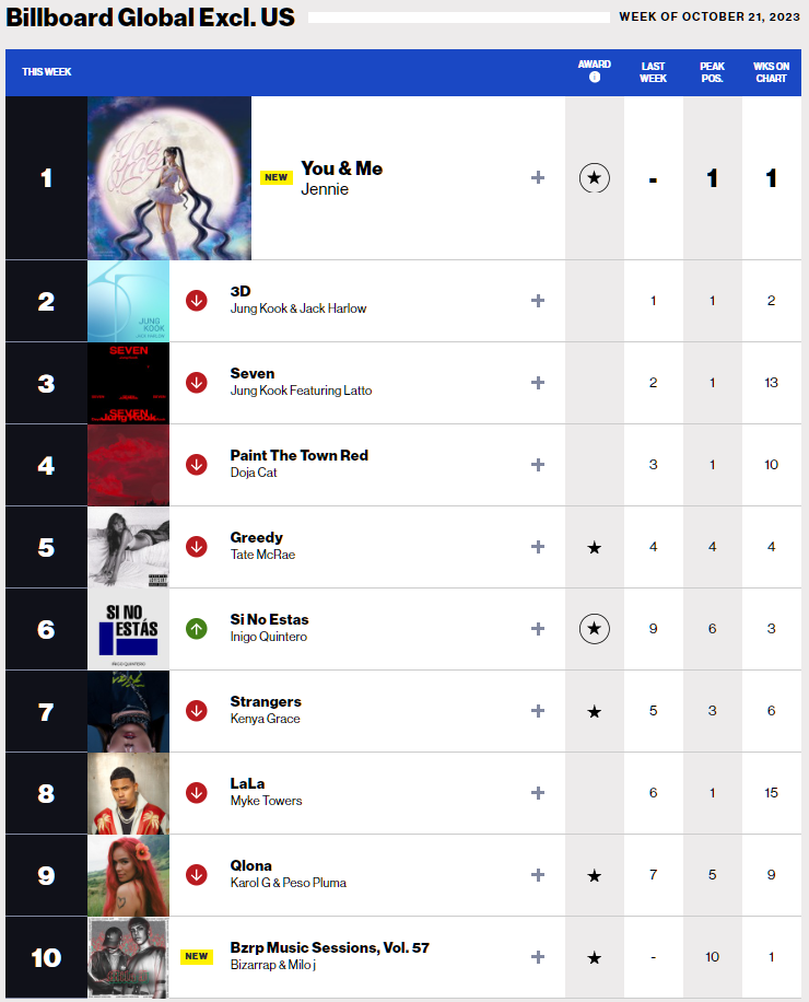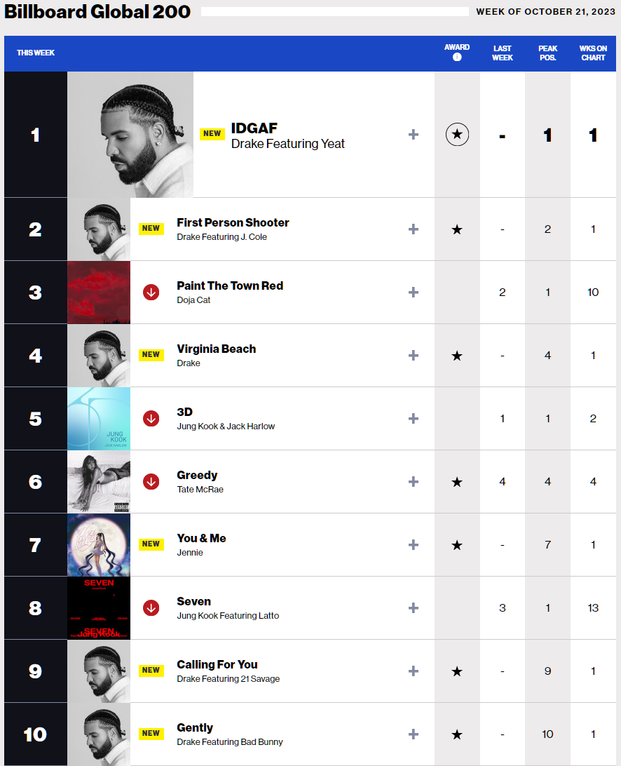 이번주 Global 200 차트에서는 Drake featuring Yeat의 IDGAF가 1위로 데뷔하였습니다. (Hot 100 차트에서는 2위) 그래도 이 차트에서는 정국 & Jack Harlow의 '3D'가 5위를 지키고 있으며, 블랙핑크 제니(Jennie)의 신곡 'You & me'가 7위로 데뷔하였습니다. 제니의 You & me는 미국을 제외한 글로벌 차트에서는 1위로 데뷔하였습니다.