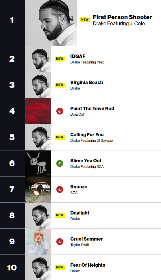 이번주 빌보드 차트는 Drake가 휩쓸었습니다. Drake의 8집 앨범 "For All The Dogs"가 발매되면서 빌보드 200 차트 1위로 데뷔함과 동시에, 수록곡 전부가 빌보드 Hot 100 차트에 진입하면서, J.Cole과 함께 한 'First person shooter'가 빌보드 Hot 100 차트 1위로 데뷔하였습니다.