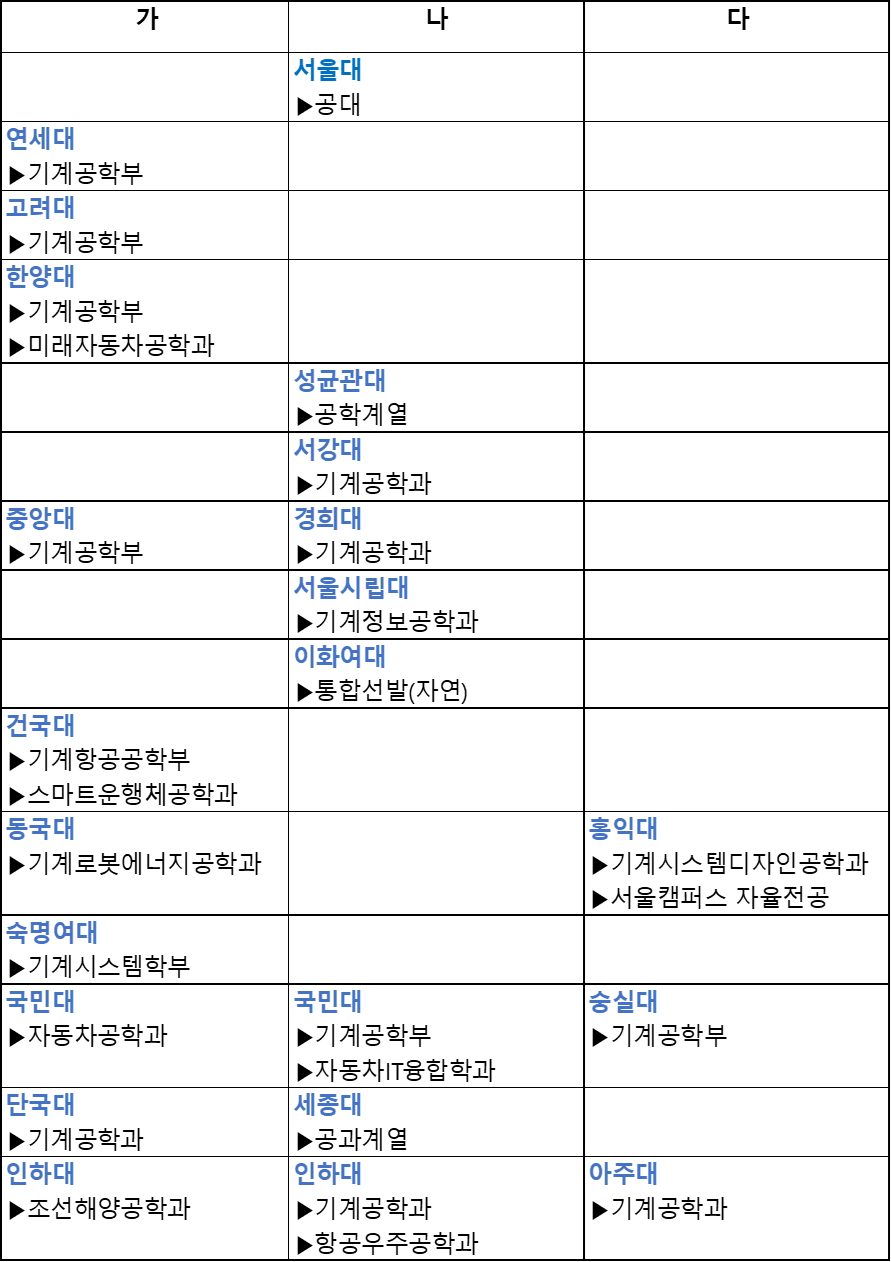 < 2024학년도 기계공학, 자동차공학 계열의 가나다군 학교별 구분 - 인서울 >