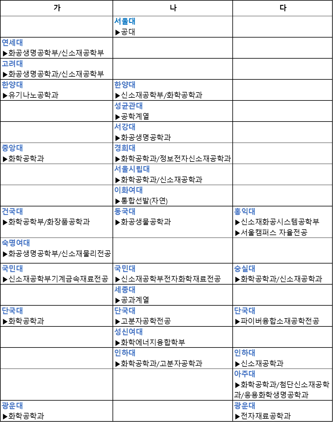 < 2024학년도 화학공학, 화공생명공학, 신소재공학 계열의 가나다군 학교별 구분 - 인서울 >