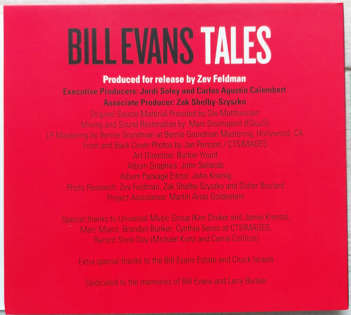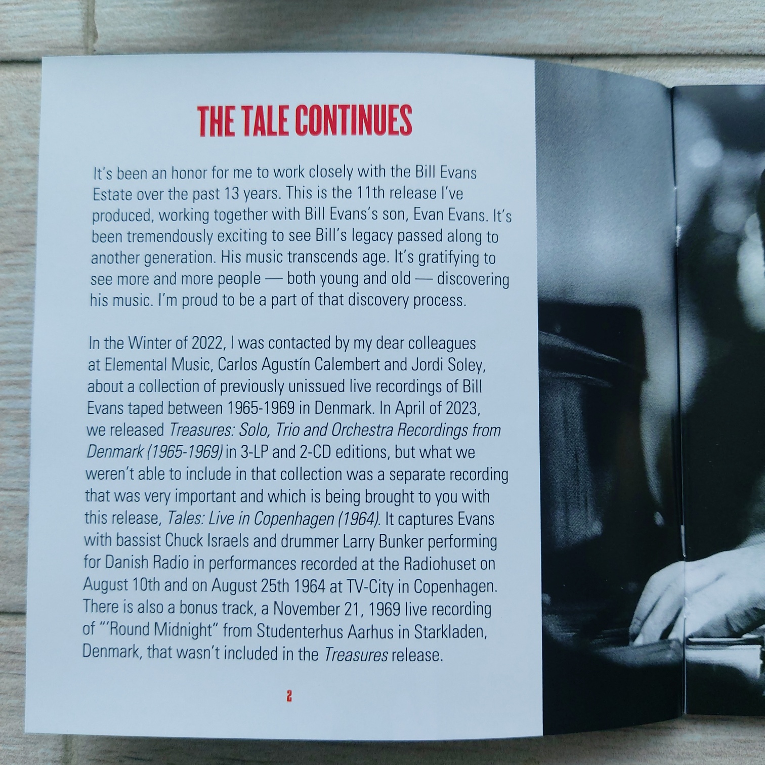 These 11 tracks are glorious; a gift for all of us to relish these many decades after Bill's physical departure from this earth. It's thrilling for me to see these recordings come out, extendinga welcoming hand to jazz fans who are just exploring Bill Evans's nusic for the first time. Tales is a wonderful document that captures the spirit, essence and beauty of what Evans was all about. For this release, I spoke in 2022 with the exceptional bassist on these recordings, Chuck Israels, and also with Brandyn Bunker, the widow of the prodigiously gifted and under-appreciated drummer Larry Bunker. Chuck and Larry are both great musicians who deserve to be celebrated for their contributions to Bill's trio and to jazz music. Once again, I wish to thank the Danish producer Ole Matthiessen, as these recordings only exist because of him. It's also been a joy to have Bill Evans scholar, author and columnist Marc Myers contribute wonderful liner notes. Words cannot completely express the greatness of Bill Evans's legacy, but it's great to have the foremost Evans scholar weigh in so perceptively and elegantly. It's a pleasure to be able to present Tales, this previously unissued recording to the world.