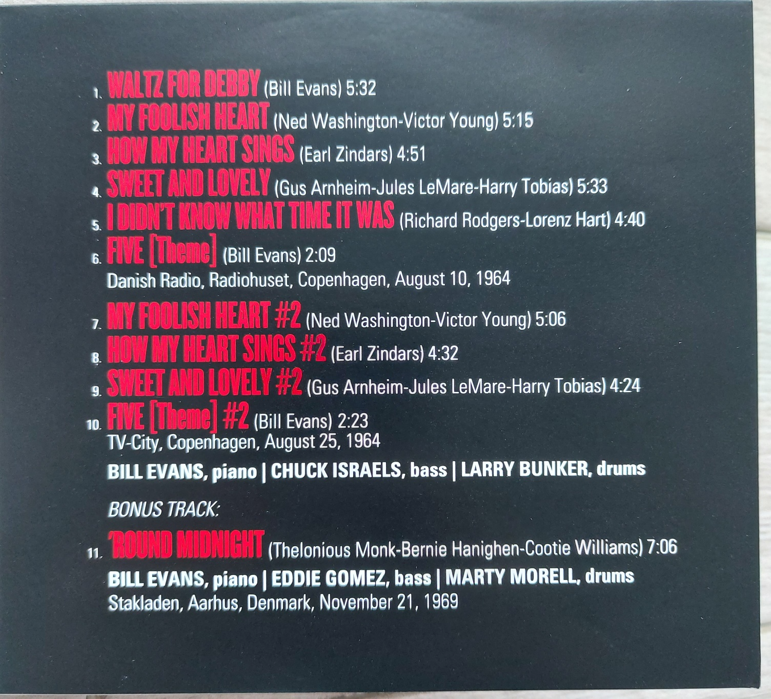 1964년 덴마크 코펜하겐에서의 실황 녹음 중심 수록곡입니다. 첫 6곡은 8월 10일에 라디오방송국에서 청중없이 녹음된 곡들이고 그 다음 4곡은 8월 25일에 TV 방송국에서 청중 앞에서 라이브로 녹음된 것이 take2로 수록되었고, 마지막 보너스 트랙은 1969년 11월에 오르후스 대학교 (Aarhus University)의 학생 기숙사의 일부인 학생 회관 겸 콘서트홀로 1964년 10월에 개장했던 Stakladen(스타클라덴)에서의 라이브 연주중 녹음된 곡입니다. 사실 1969년 11월 오르후스 대학교에서의 트리오 공연은 2023년 덴마크에서의 미공개곡 (솔로, 트리오, 오케스트라 녹음)을 담아 발매했던 "Treasures"의 3번째 LP 앞뒷면으로 소개되었었는데, 그때 빠졌던 곡이 이번 음반에 보너스 트랙으로 실렸습니다.