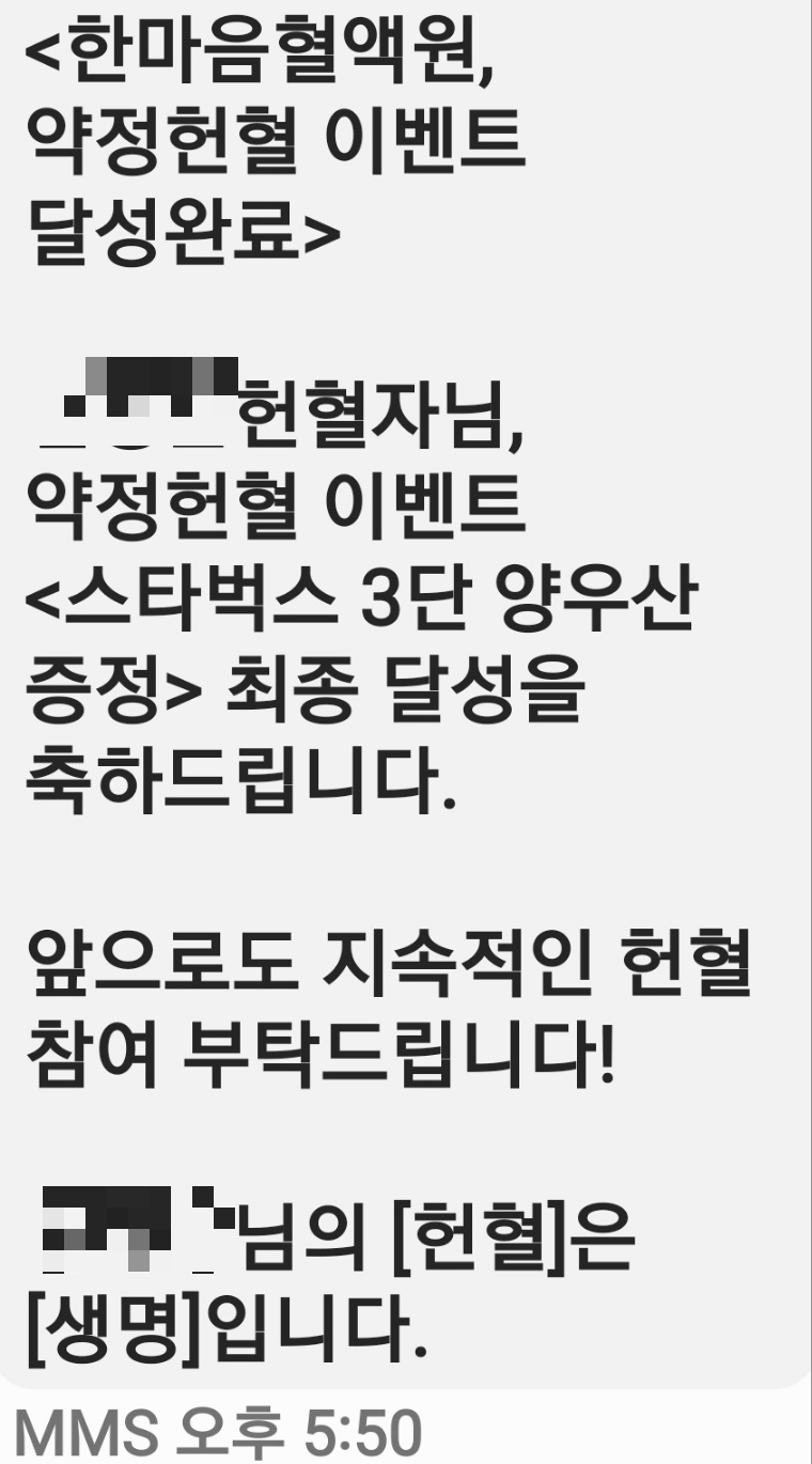 3번 헌혈하니, 이렇게 문자로 달성완료가 날라왔습니다.