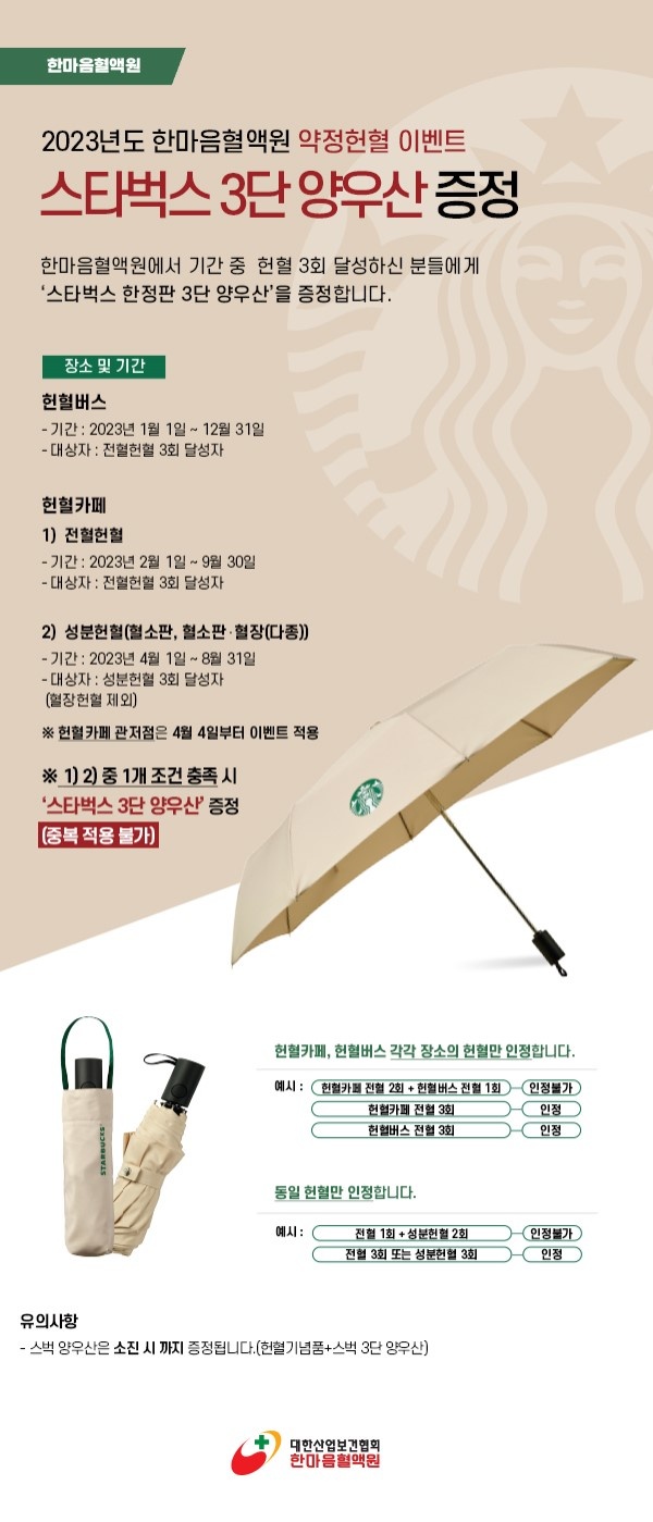 이게 그 이벤트입니다. 성분헌혈 (혈소판이 들어간) 3회를 달성하면, 스타벅스 3단 양우산을 증정합니다.