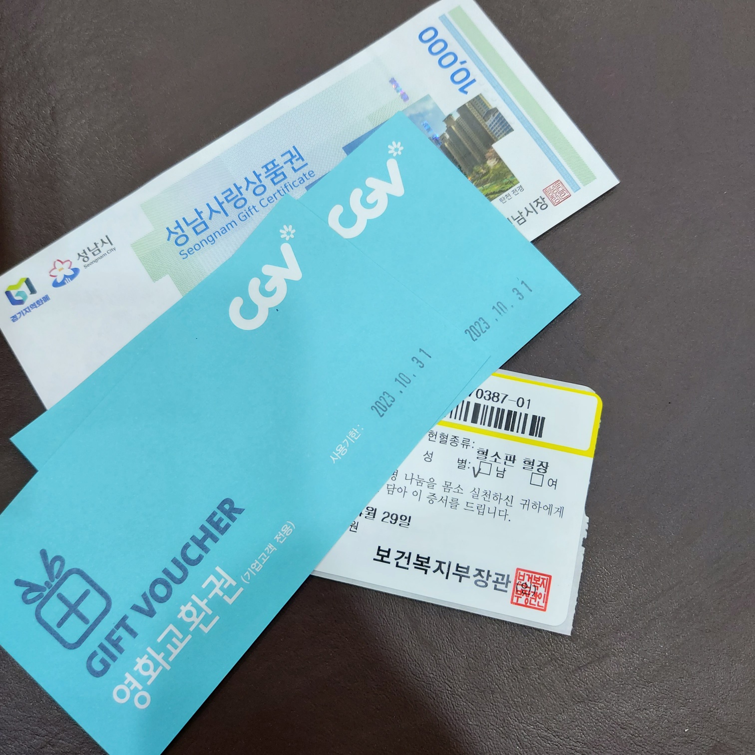 이렇게 극장관람권 2장과 지역상품권 1장을 받았습니다.