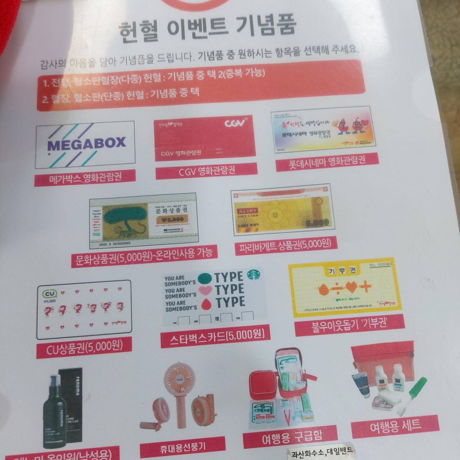헌혈카페에서 제공하는 헌혈 기념품입니다. 전 보통 영화관람권으로 선택합니다. 코로나때는 극장을 못갔으니 파리바게트 상품권을 선택했었구요 ㅎ