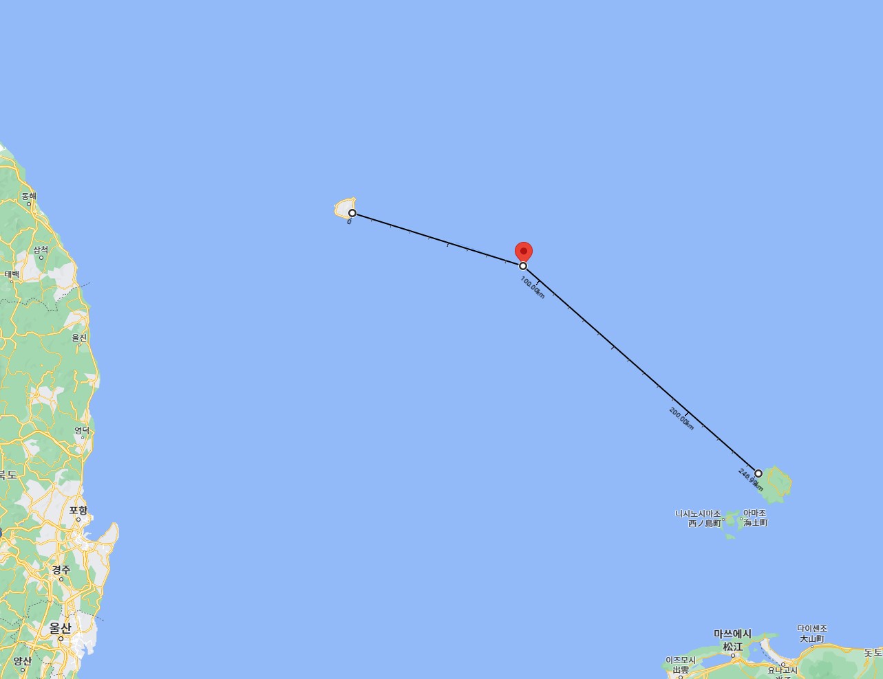 구글 맵에서 직접 독도의 거리를 측정해보았습니다. 실제 거리와 조금 차이가 나는데, 워낙 넓은 지도이다보니 정확한 위치를 클릭하지 못한 오류라고 보면 됩니다 ^^;
